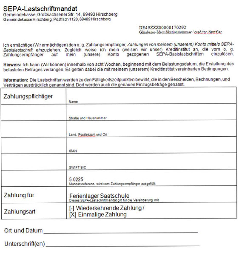 Mit der Online-Anmeldung Ihres Kindes stimmen Sie dem hier abgebildeten SEPA-Lastschriftmandat zu.